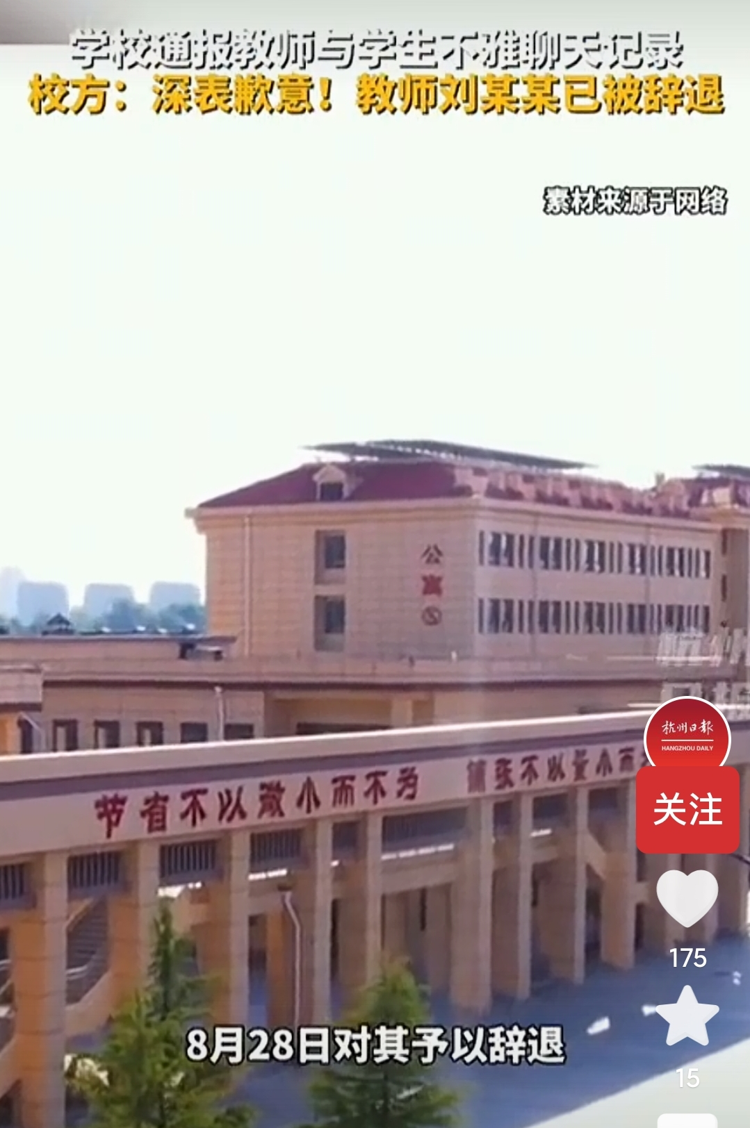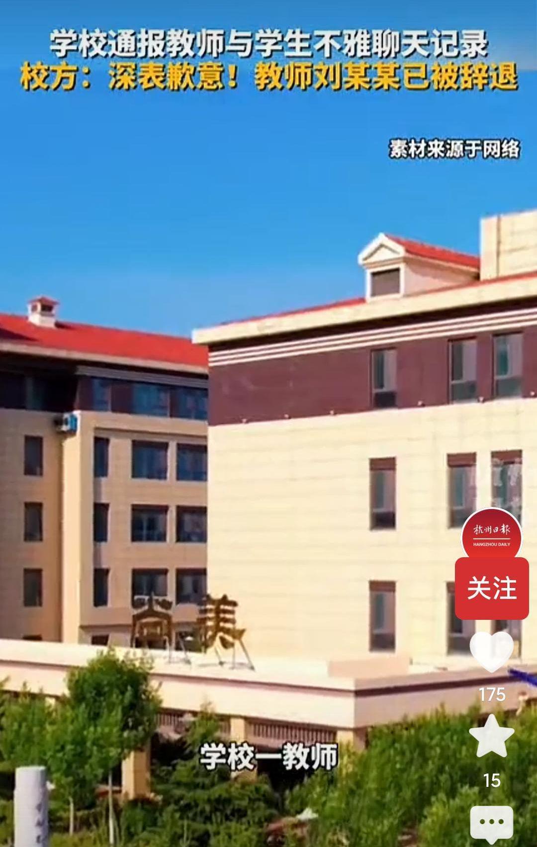 8月30日,山东蓬莱第二中学发布情况通报称,是教师刘某某因为违反校规校纪和教师职业道德,8月28日已经对他进行辞退。